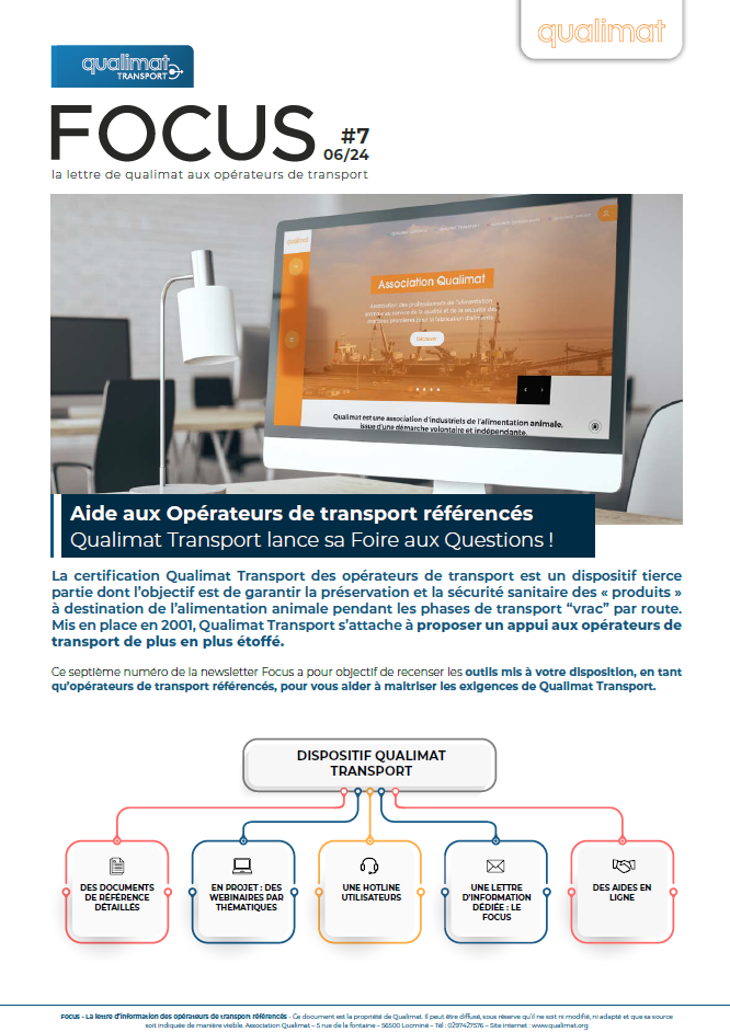Le nouveau numéro du Focus est dédié aux outils mis à disposition des Opérateurs de Transport pour les aider à maîtriser les exigences Qualimat Transport. Nous y annonçons le lancement d’une Foire aux Questions dédiée à Qualimat Transport désormais disponible sur notre site internet. La liste des questions sera complétée à partir des remontées du terrain dans l’objectif de construire un outil efficace et utile à tous.